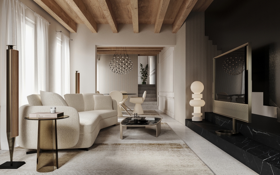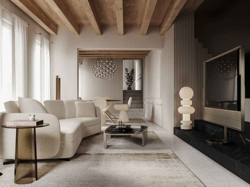 Due piani di matericità profonda ed eleganza non strillata. Tra boiserie, travi a vista e una rilettura dei canoni classici modellati sulle esigenze dell'abitare contemporaneo.