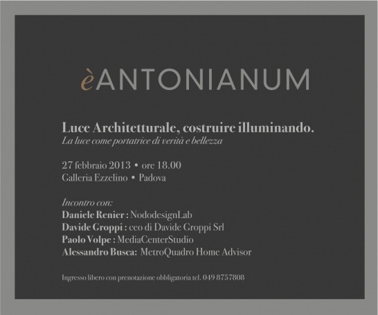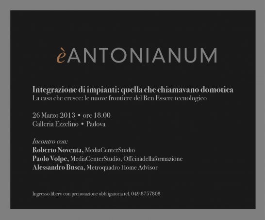 Continua a leggere >>Martedì 26 marzo 2013, nel nuovo spazio èAntonianum allestito in Galleria Ezzelino, si è tenuto l'incontro aperto al pubblico sul tema: INTEGRAZIONE DI IMPIANTI: QUELLA CHE CHIAMAVANO DOMOTICA. La casa che cresce: le nuove frontiere del Ben-Essere tecnologico.