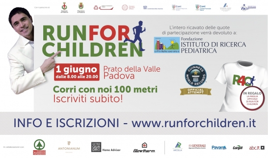 Continua a leggere >>Run for children 2013: obiettivo iscrizioni e record "A pochi giorni dal grande evento sportivo-benefico di Prato della valle, il vicesindaco Ivo Rossi invita ad iscriversi per raggiungere il primato sulle 12 ore, e lo fa da un luogo insolito ma significativo: il terrazzo dell'Antonianum residenze“