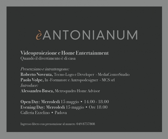 Continua a leggere >>VIDEOPROIEZIONE E HOME ENTERTAINMENT Quando il divertimento è di casa… Un evento e un open-day per toccare con occhi e orecchi le innovazioni e le bellezze dell’entertainment che il mondo delle tecnologie oggi rende disponibile. èANTONIANUM open day: mercoledì 15 maggio • 14.00 - 18.00 evening event: mercoledì 15 maggio • ore 18.00 Galleria Ezzelino • Padova