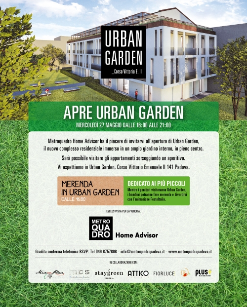 19/05/2015Il giorno Mercoledì 27 maggio 2015 dalle ore 16:00 alle ore 21:00 apre URBAN GARDEN, il nuovo complesso residenziale immerso nel verde, situato in Corso Vittorio Emanuele II n. 141.