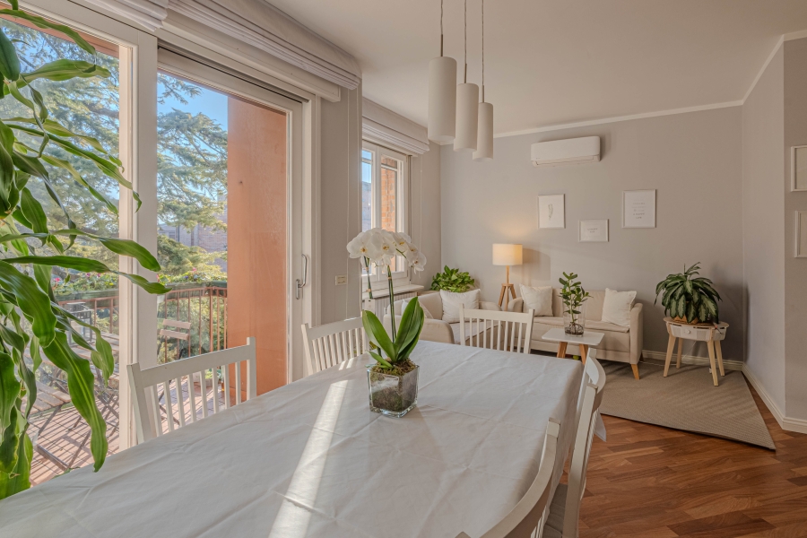 L’immobile si trova all'ultimo piano dell'edificio, al quarto piano con ascensore ed è caratterizzato da ambienti ampi e luminosi. L’ingresso conduce a una zona giorno open space, composta da area pranzo–soggiorno e da un ulteriore spazio living dedicato al relax e alla TV. Il soggiorno è impreziosito da una grande vetrata che permette l’accesso a una piacevole terrazza, perfetta per colazioni all’aperto e pranzi conviviali.