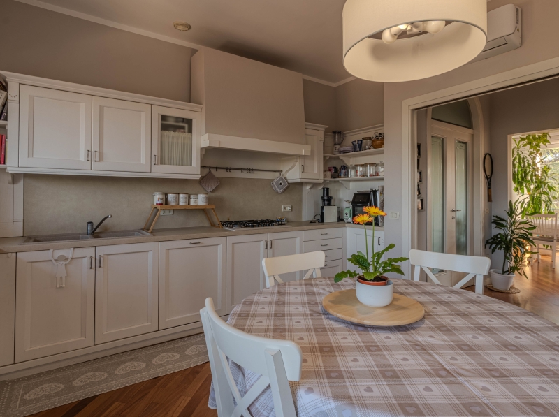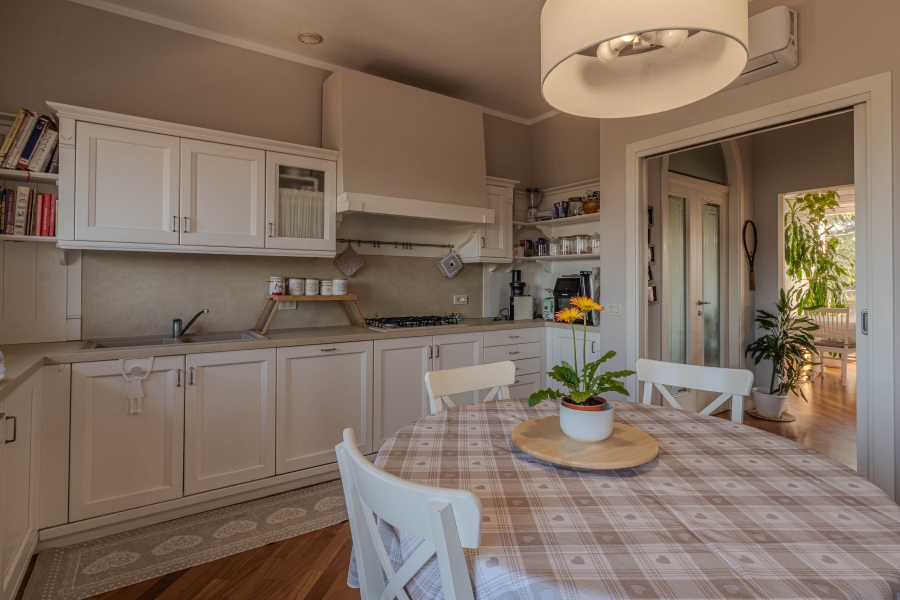 La cucina è ampia e abitabile, anch’essa dotata di terrazza privata, ideale per chi ama vivere la casa anche negli spazi esterni.