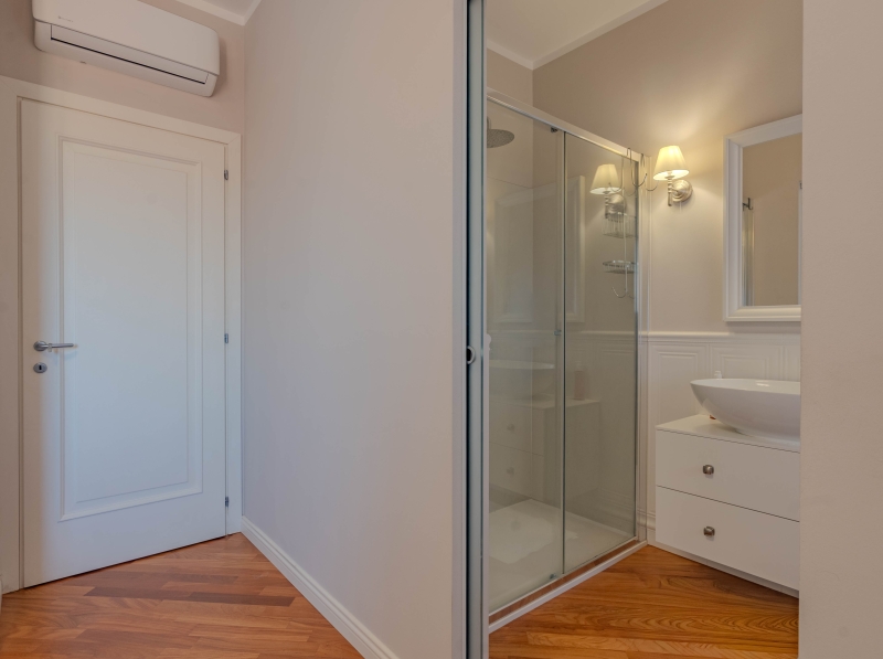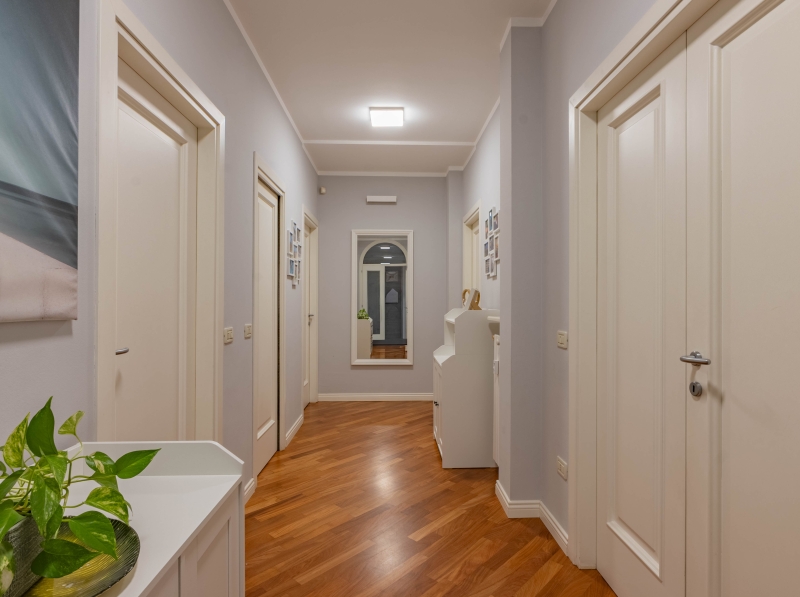 La zona notte comprende due camere matrimoniali, di cui una con bagno privato, oltre a un secondo bagno finestrato a servizio dell’appartamento e un'ulteriore stanza/studio.