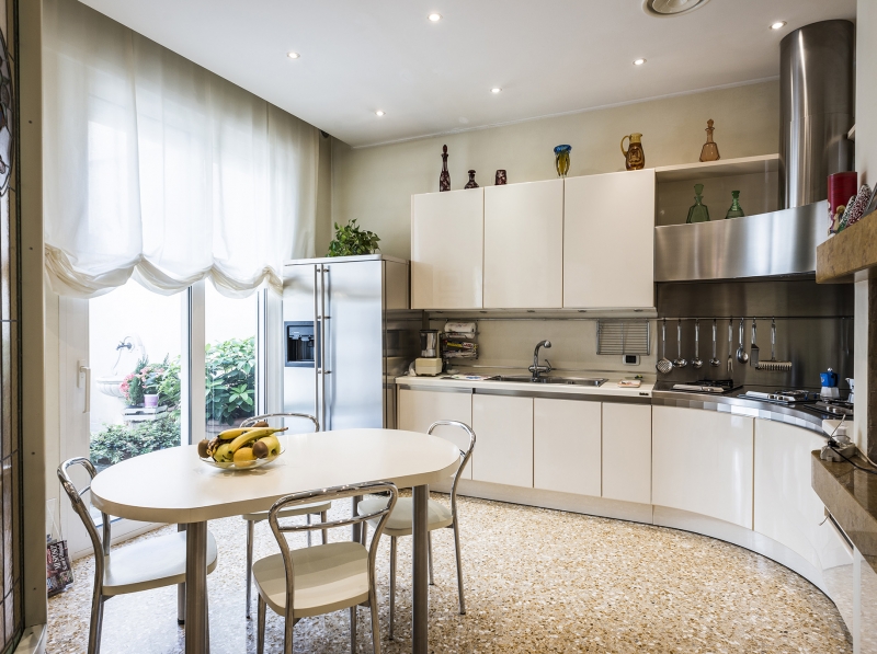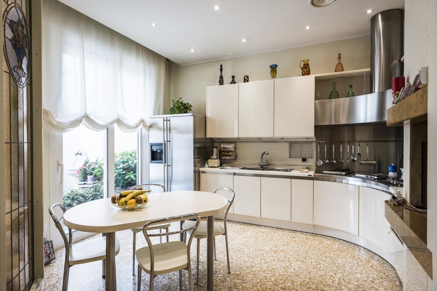 Una bella luminosa cucina abitabile, uno studiolo, una grande stanza lavoro con zona lavanderia/stireria attrezzata e una spaziosa camera ospiti con bagno completano il piano terra.