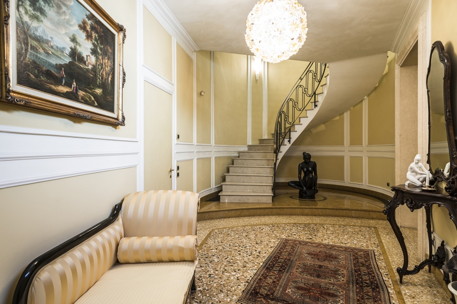 L'ingresso spazioso con ampia scala elicoidale ci accoglie e ci introduce nel salone con camino che si affaccia su un piccolo spazio verde privato.