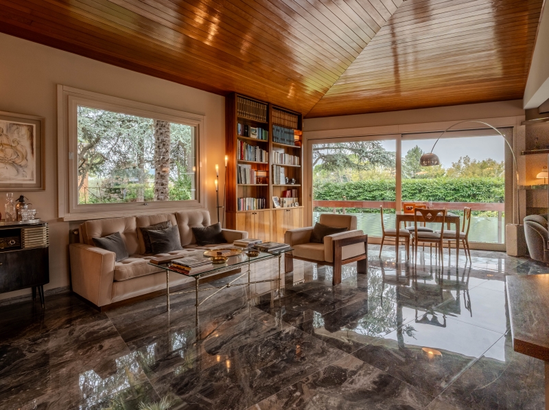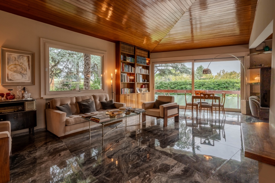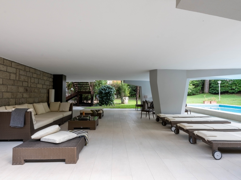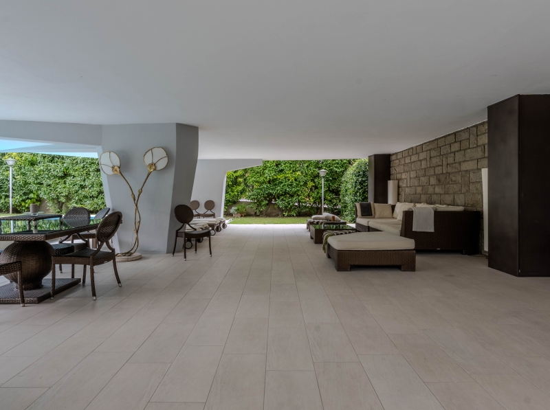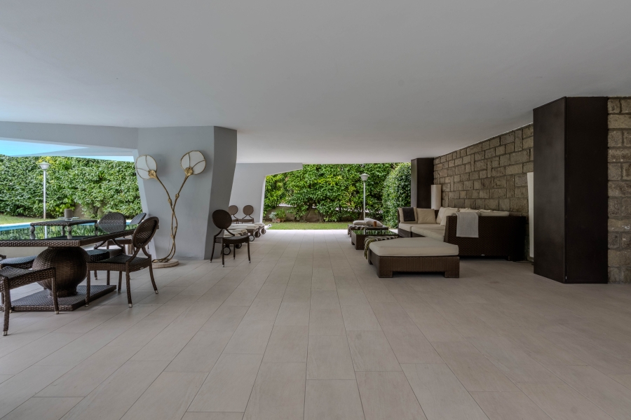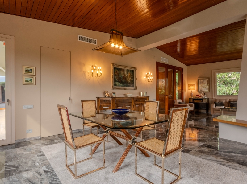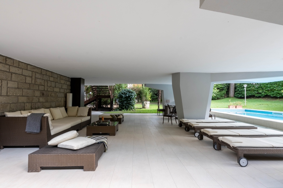 Il primo piano si apre con un maestoso e luminoso soggiorno, perfettamente integrato con la zona pranzo, che si estende verso una terrazza panoramica con vista diretta sulla piscina.