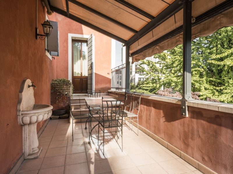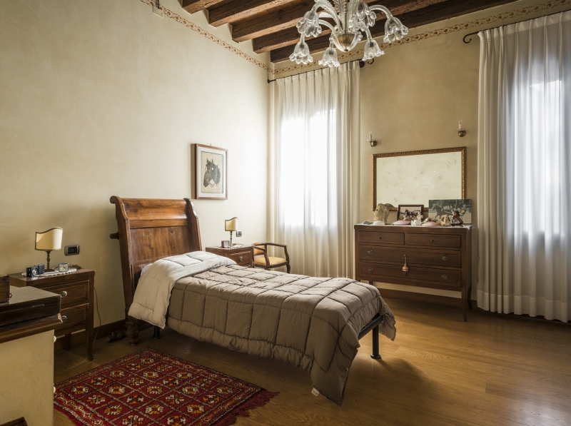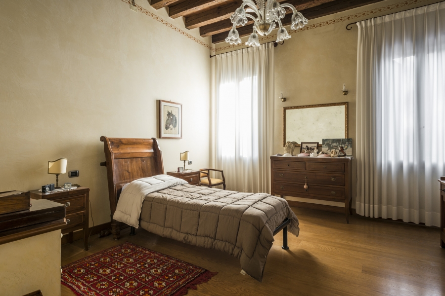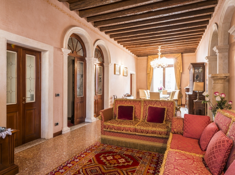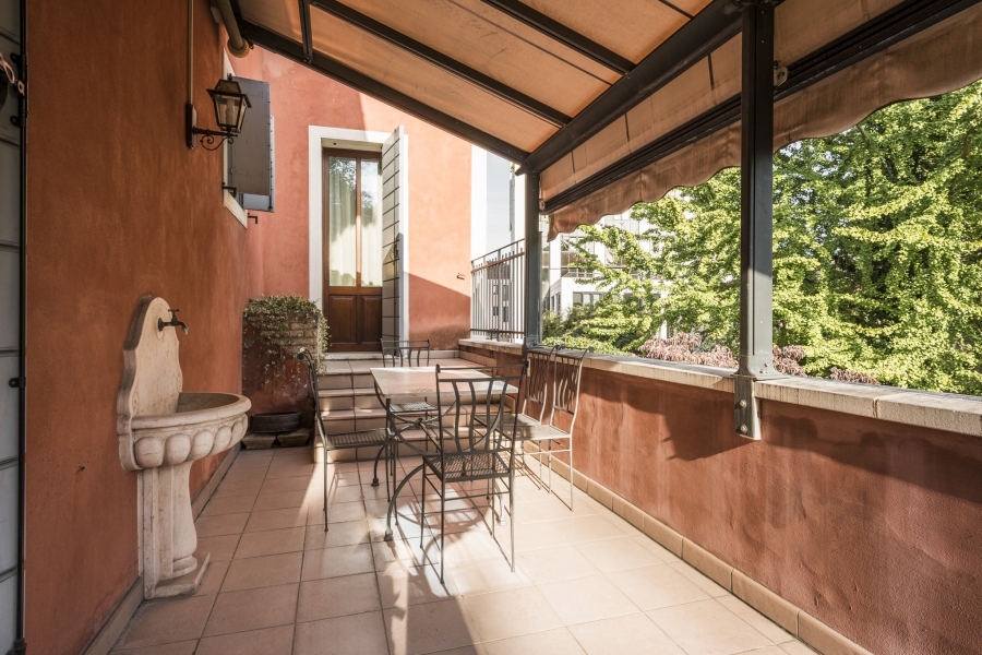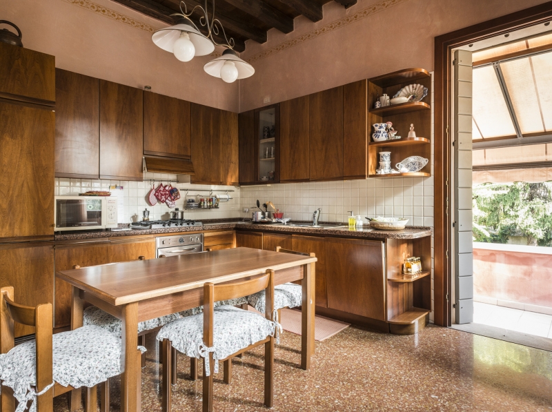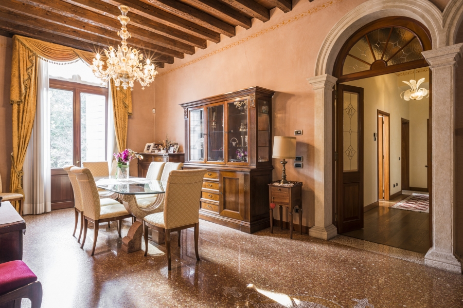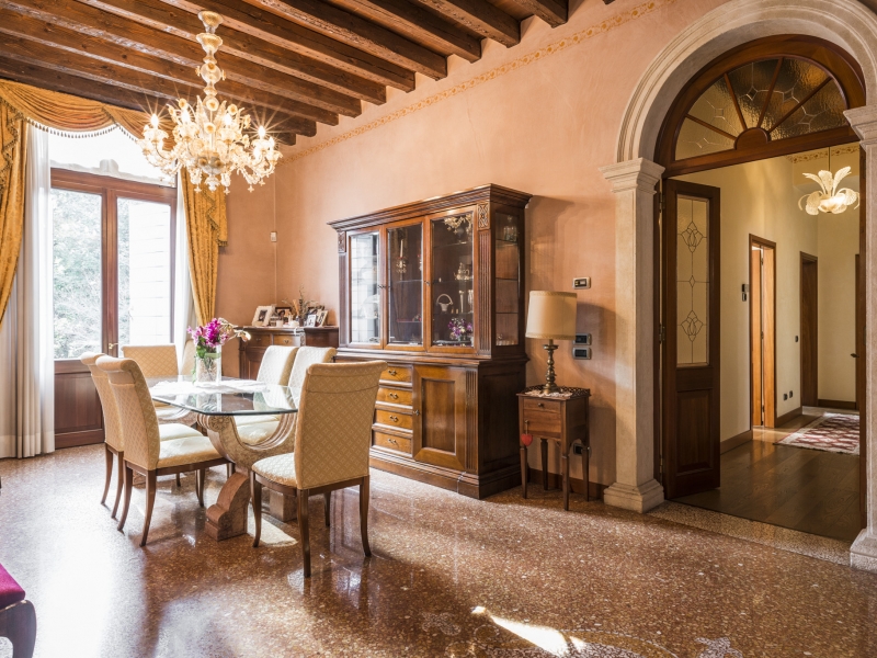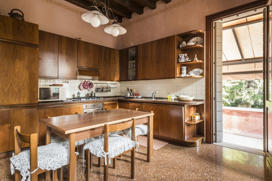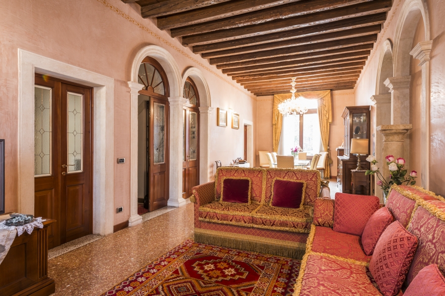 Un grande salone centrale con doppia esposizione di luce ospita la zona giorno arricchita da belle travi a vista e terrazzo veneziano, da cui si accede direttamente ad una ampia cucina tinello alla veneta e grande terrazza abitabile.